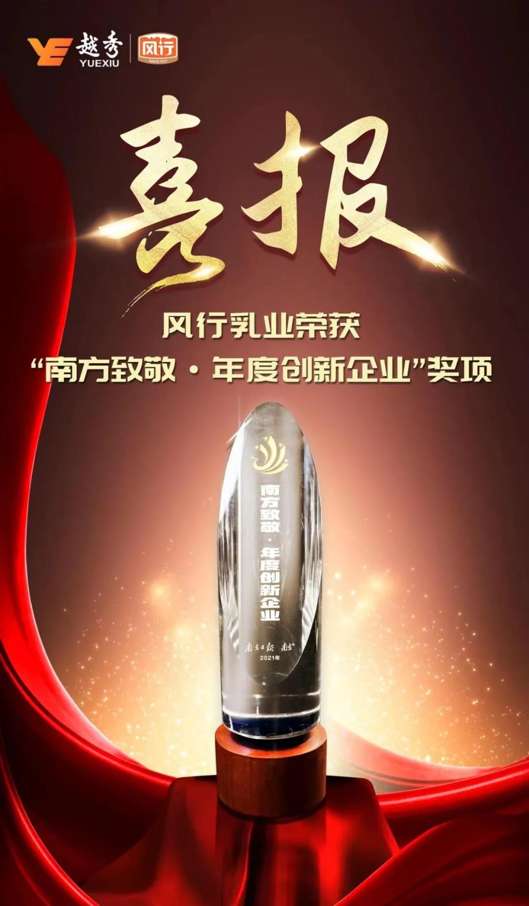 喜讯!风行乳业荣获“南方致敬·年度创新企业”奖项