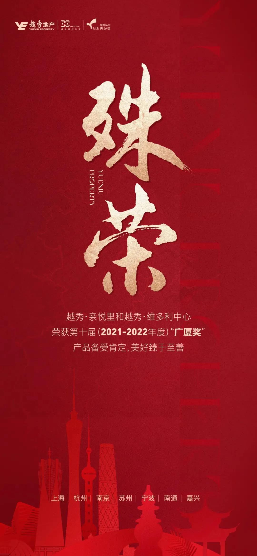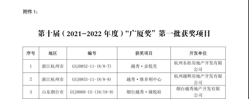 12月29日,由中国房地产业协会、住房和城乡建设部住宅产业化促进中心共同组织的第十届(2021-2022年度)“广厦奖”第一批评选结果正式揭晓。越秀地产共有3个项目获奖,分别是越秀地产于杭州打造的越秀·亲悦里项目和越秀·维多利中心项目,以及于烟台打造的越秀·臻悦府项目。此次评选,专家组对越秀地产项目的综合品质表示高度认可,特别是对项目的精工品质、技术支持和创新设计予以较高评价,这代表越秀地产的产品品质得到了国家级奖项的高度肯定。