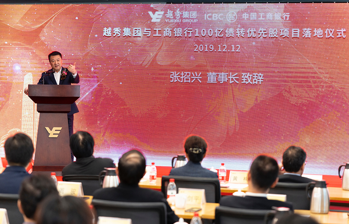 On December 12, Launching Ceremony of Yuexiu Group and Industrial and Commercial Bank of China (ICBC) Debt to Preferred Stock Project was held in Guangzhou International Financial Center (IFC). Hu Hao, Vice President of ICBC head office, Xing Xiang, Deputy Secretary General of Guangzhou Municipal People's government, Chen Haodian, Director of Guangzhou State-owned Assets Supervision and Administration Commission (Guangzhou SASAC), Chen Ping, Deputy Inspector of Guangzhou Local Financial Supervision and Administration Bureau, Zhang Zhenghua, President of ICBC Financial Assets Investment Co., Ltd., Zhang Zhaoxing, Chairman of Board of Directors of Yuexiu Group, and other officials and guests attended the ceremony. This not only marks the official implementation of Yuexiu Group's RMB 10 billion debt-to-preferred-stock plan, but also the first approved non-listed non-public joint stock company debt-to-preferred-stock project in China, which will become a vivid model of China's capital market and state-owned enterprise reform, so as to promote the development of the group's main business to achieve complementary resources and advantages. More than 150 leaders from Guangzhou Development and Reform Commission, Guangzhou Finance Bureau, Guangzhou Market Supervision Bureau, Guangzhou Local Financial Supervision Bureau, ICBC and members of Yuexiu Group leadership team attended the ceremony.