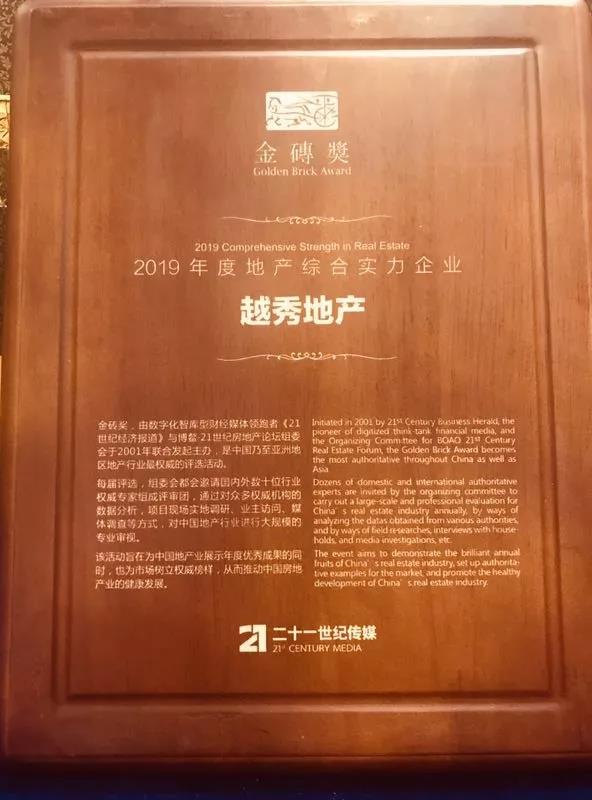Yuexiu Property’s being awarded for the greatest comprehensive strength of 2019 and the Golden Brick Award for Real Estate of China-the property management service model company of 2019 shows that it is fully recognized for its achievements on district advantage, building design and architecture, operation and management, property management and that it is encouraged to better fulfill its brand mission of building better life.