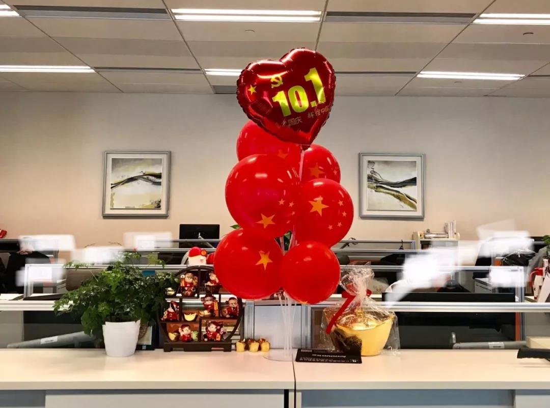 一面又一面的五星紅旗、一片又一片的裝飾布置,營造出莊嚴(yán)又神圣的節(jié)日氛圍,讓辦公室里瞬間成為紅色的海洋。